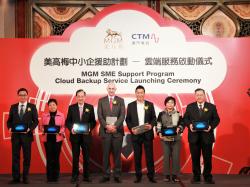 「美高梅中小企援助計劃 – 雲(yún)端服務(wù)啟動儀式」今日(15日)假澳門美高梅大宴會廳舉行。澳門中華總商會副理事長崔煜林先生、澳門郵電局局長劉惠明女士、澳門經(jīng)濟局副局長陳子慧女士、澳門生產(chǎn)力暨科技轉(zhuǎn)移中心理事長孫家雄博士、澳門貿(mào)易投資促進局投資者服務(wù)廳高級經(jīng)理黃偉倫先生、美高梅中國控股有限公司首席執(zhí)行官及執(zhí)行董事簡博賢先生,以及澳門電訊有限公司行政總裁潘福禧先生擔(dān)任主禮嘉賓,並獲政府部門嘉賓及參與計劃的中小企一同出席支持。